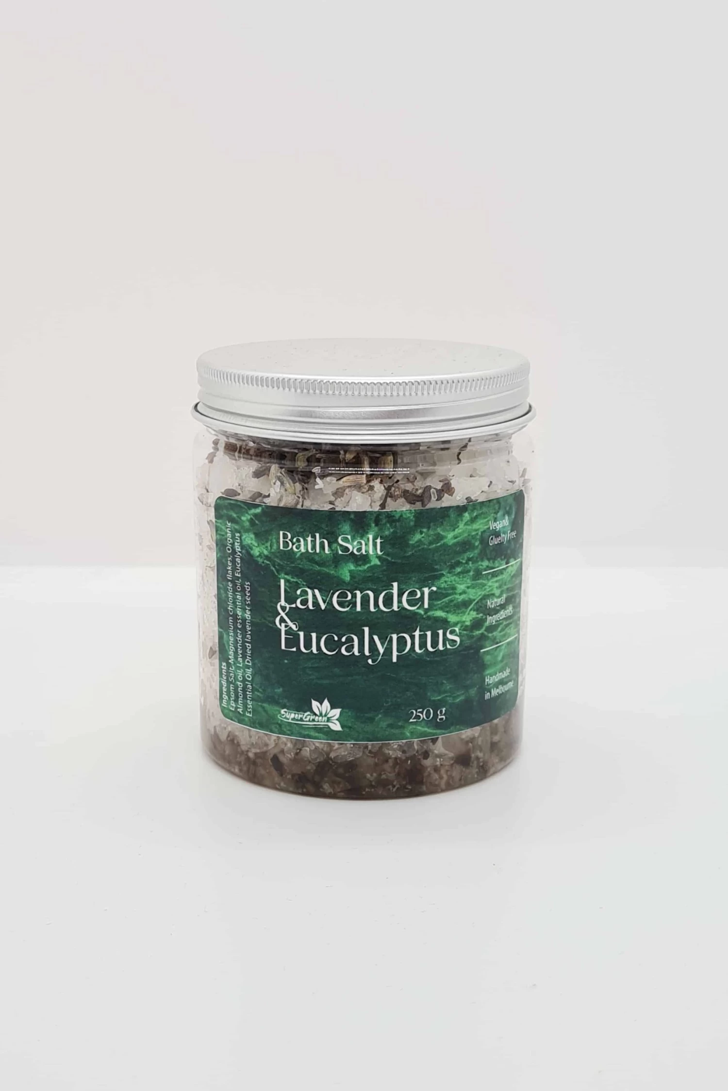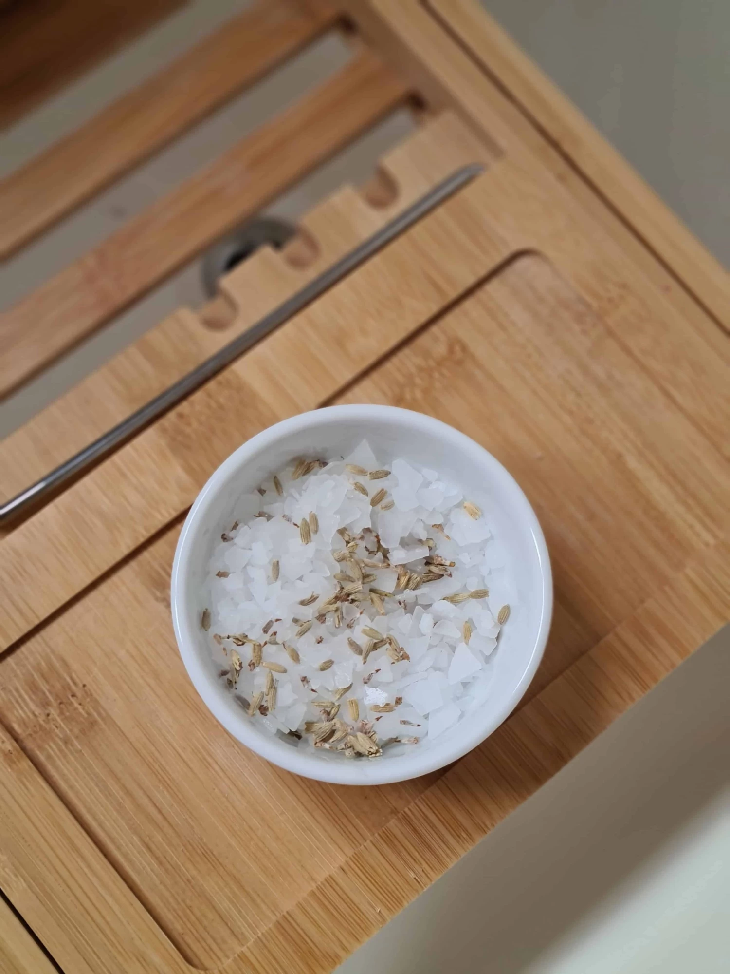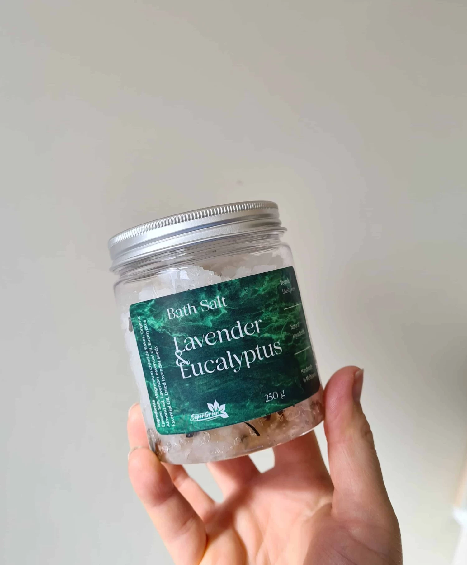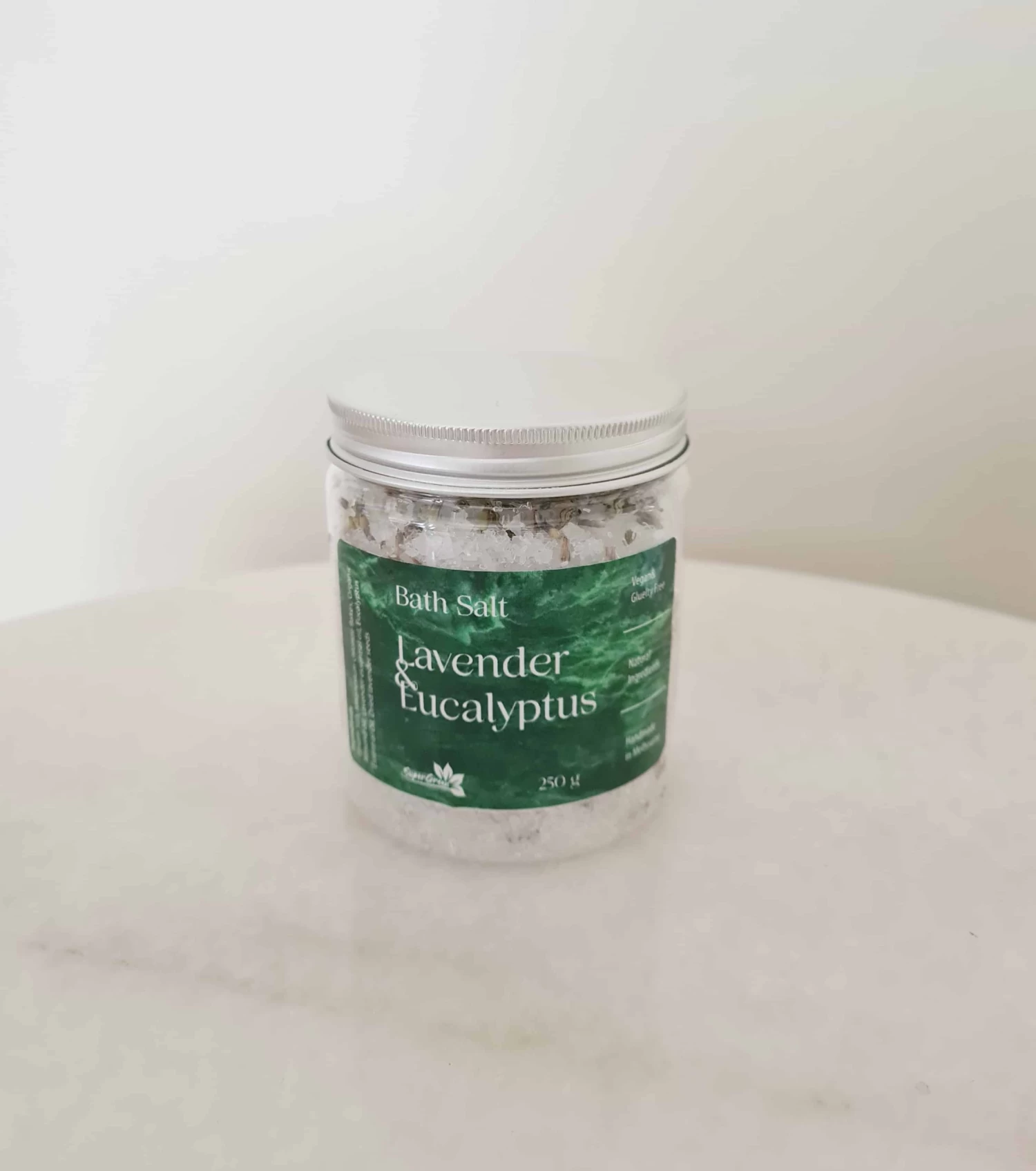 A mixture of salt, lavender, eucalyptus oil, and organic almond oil will bring peace and serenity to everyone.