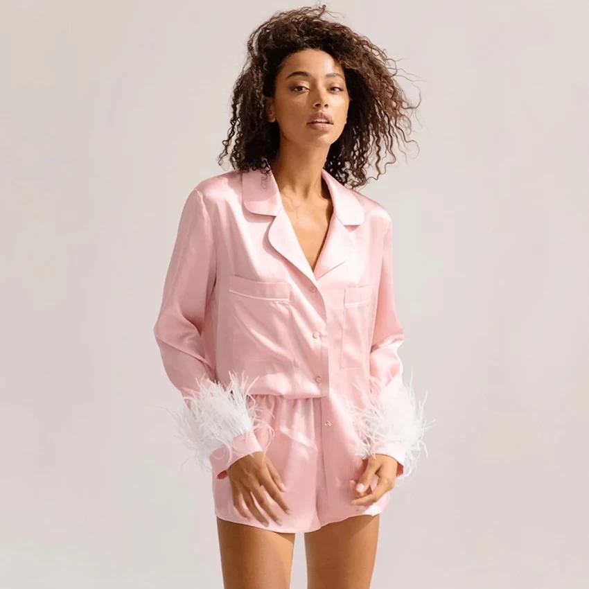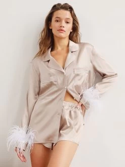 Indulge in the Feather Pyjama set 2 Piece Sleepwear. This sleepwear set is designed to provide you with a chic and stylish look that is perfect for autumn nights. The shimmering cotton drawstring shorts and pyjama shirt are made from high-quality materials that ensure maximum comfort and durability. We LOVE the feather detailing.