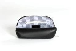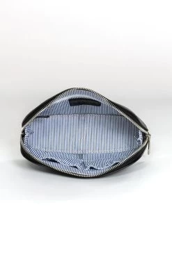 The interior of the make-up bag is lined with a classic navy and white striped cotton fabric, adding a touch of elegance. It features two elasticated pockets and one zipped pocket, providing ample space to organize and store your cosmetics and other essentials. With designated pockets, you can easily find and access your items without any hassle.