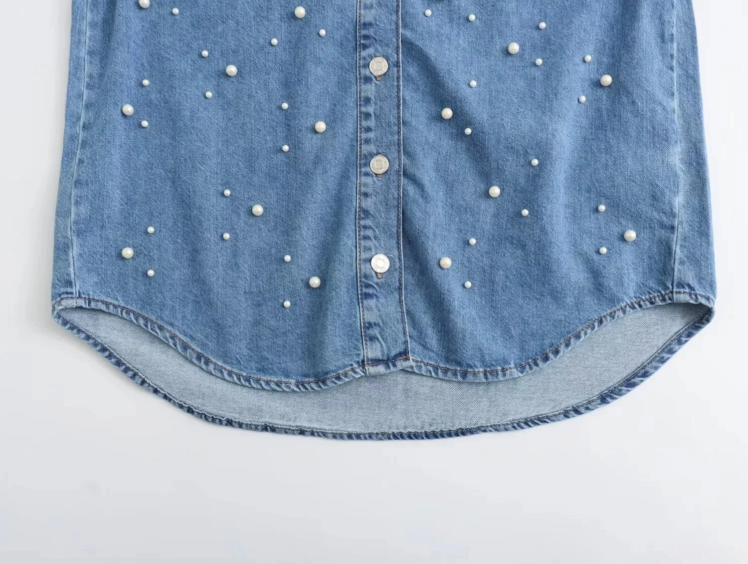 Women’s Pearl Detail Denim Vintage Long-sleeved Shirt