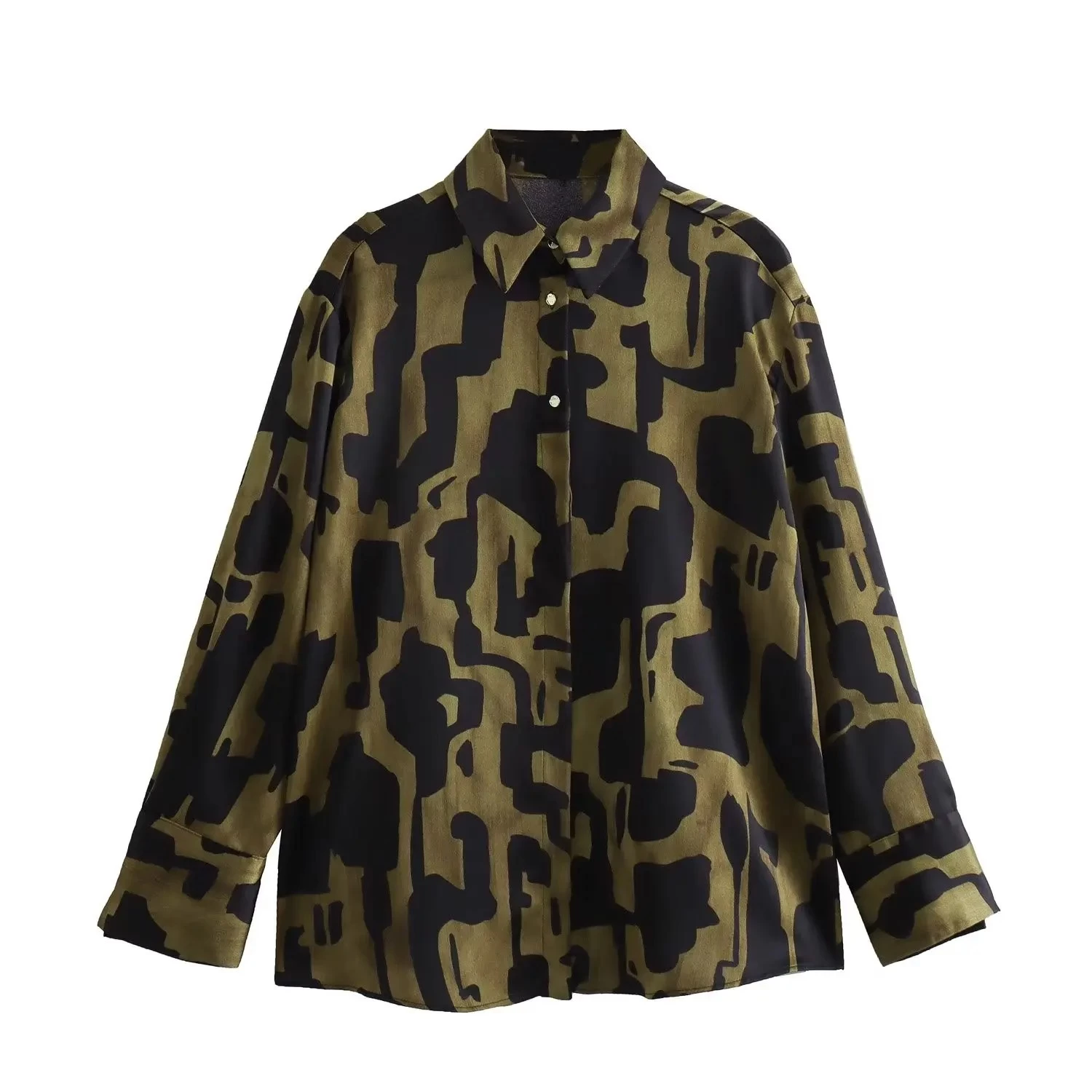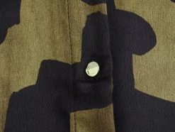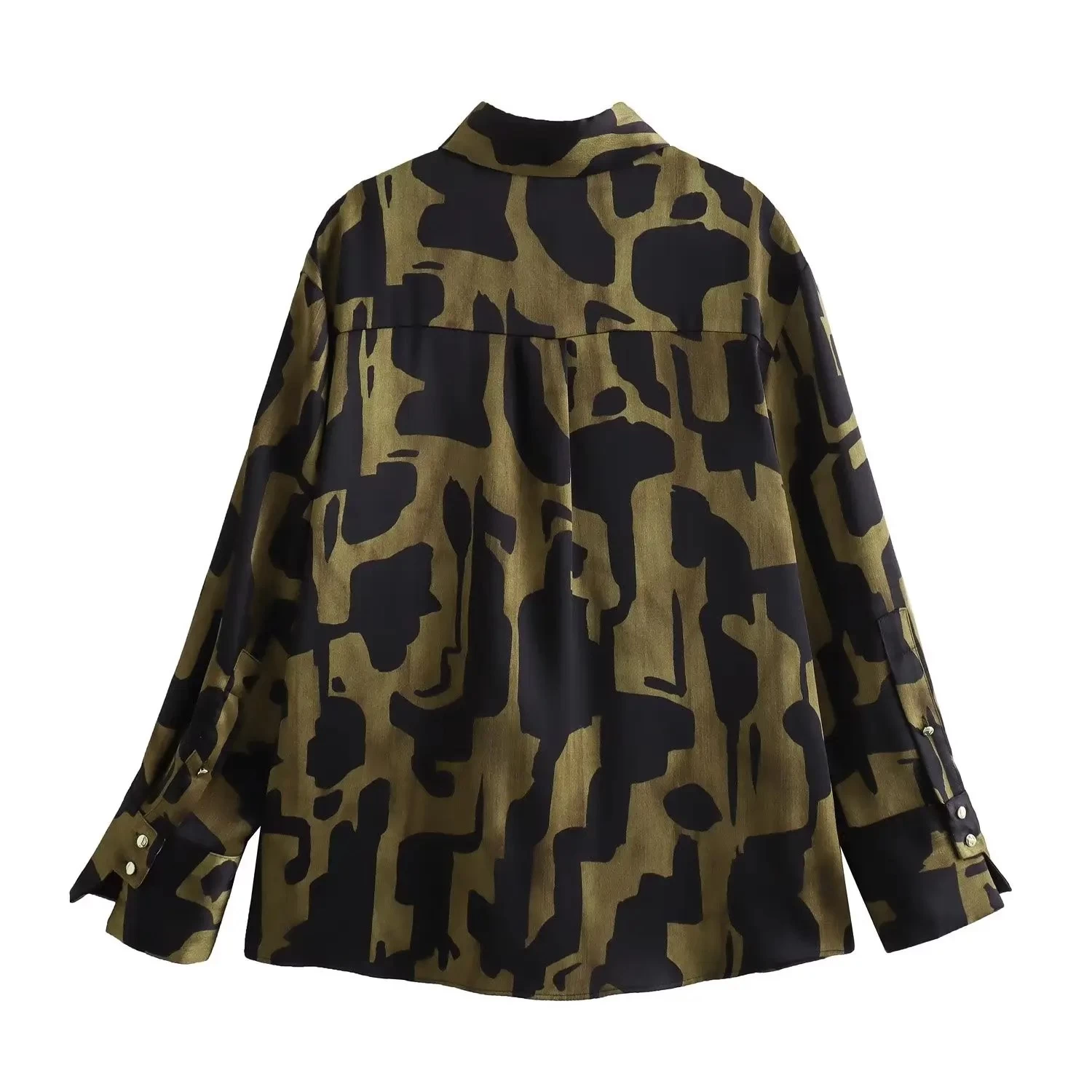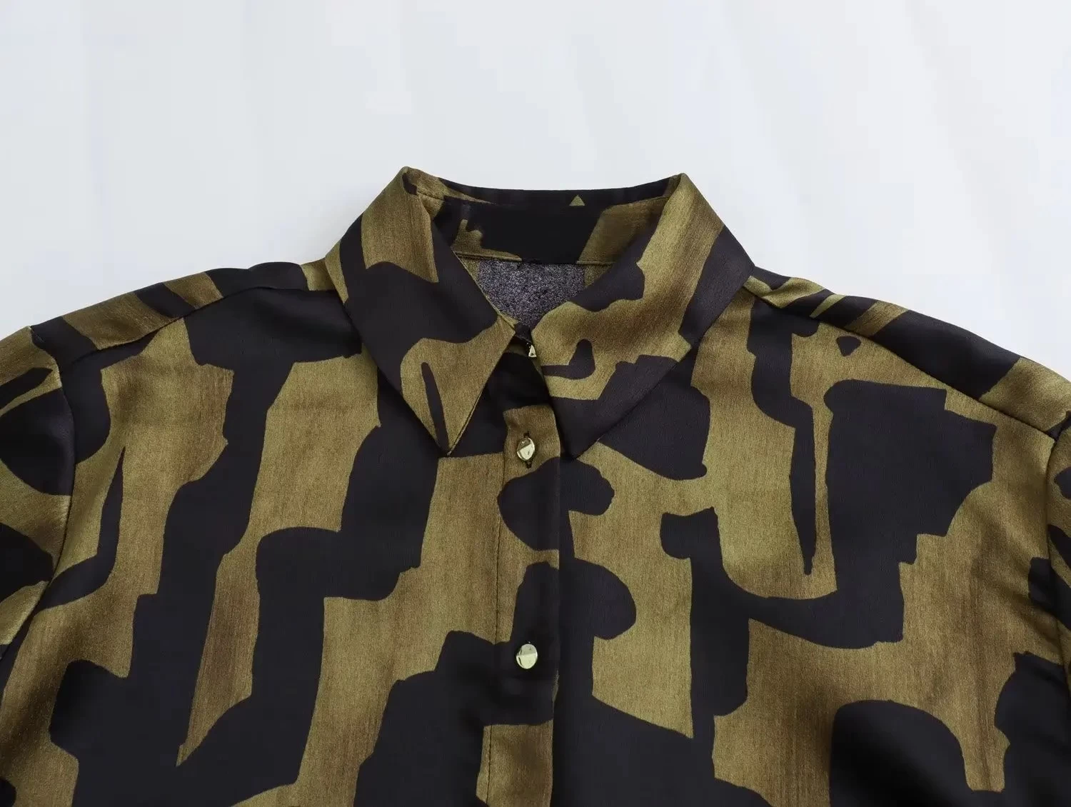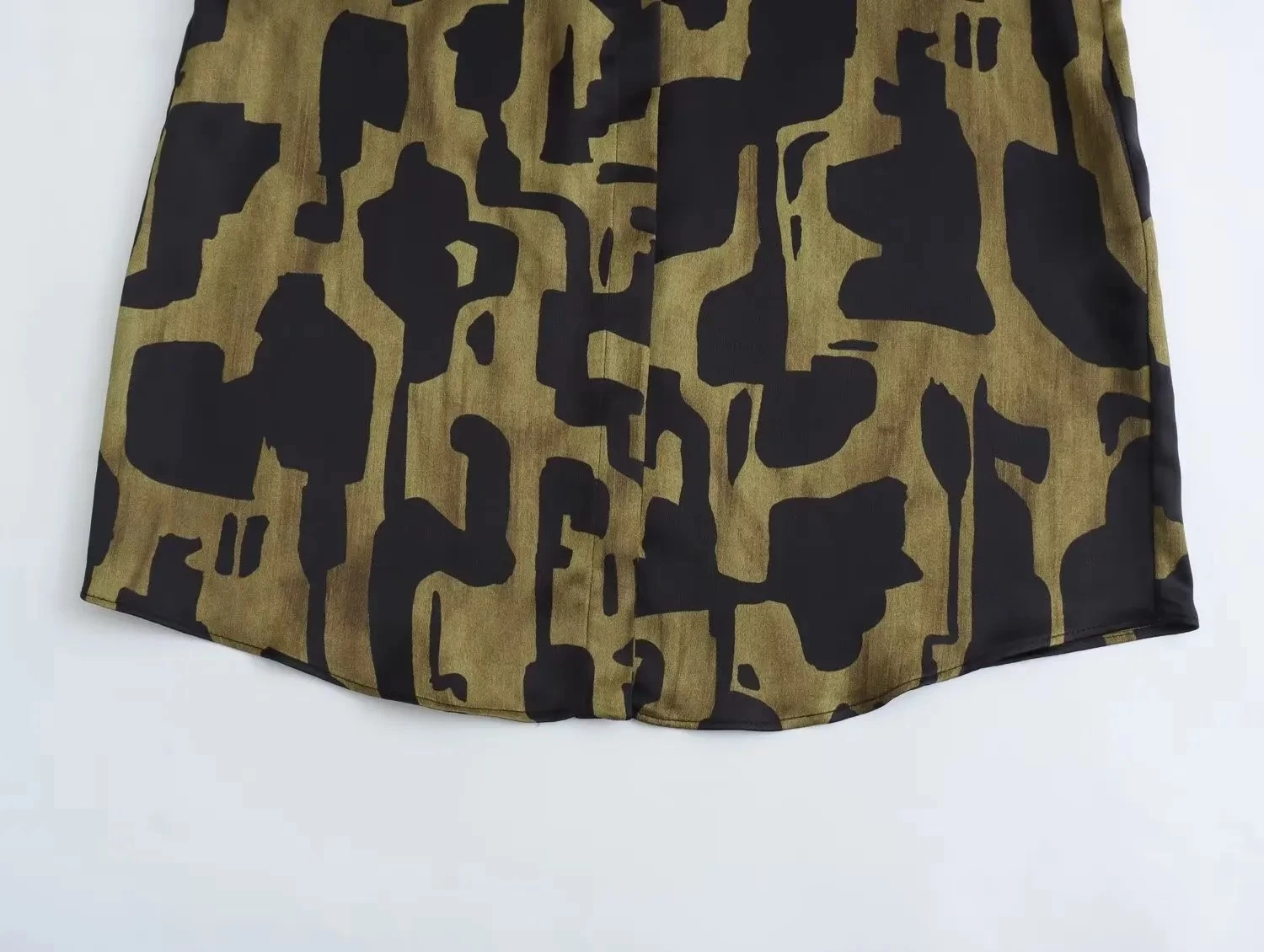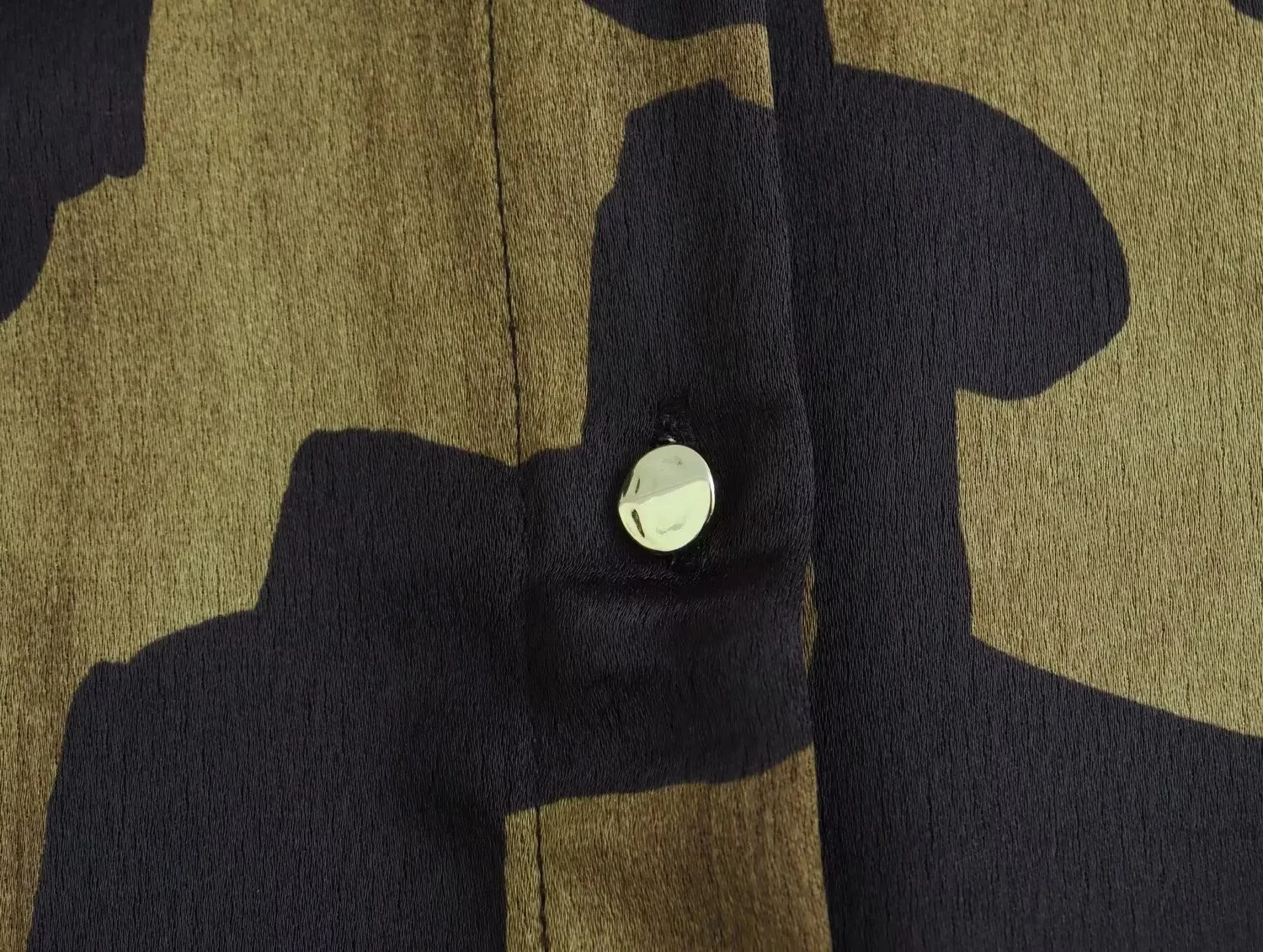 Womens Black Military Green Silk Satin Print Shirt Gold Button Detail