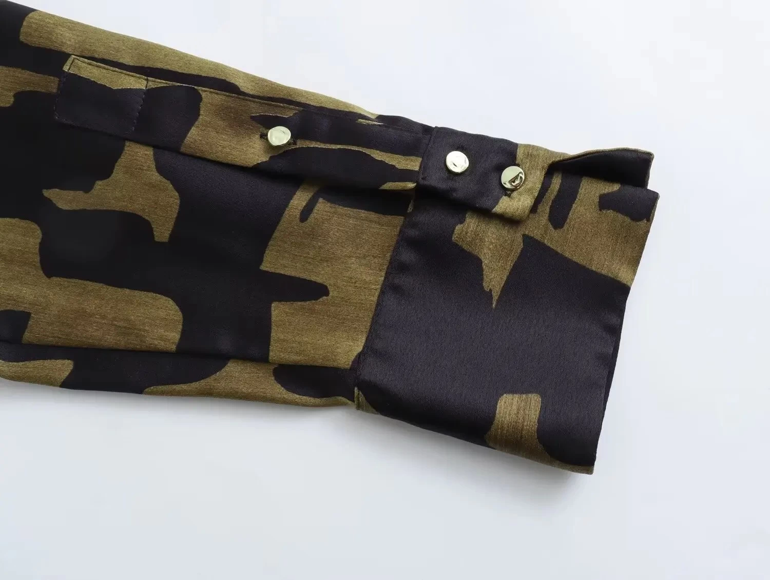 Womenβs Black Military Green Silk Satin Print Shirt featuring Gold Button Detail. Crafted from luxurious silk satin fabric, this shirt offers a sleek and sumptuous feel against the skin. The military green print adds a touch of sophistication and edge to the classic black base, while the gold button detailing infuses a hint of glamour and refinement. With its versatile design, this shirt effortlessly transitions from day to night, offering effortless style for any occasion. Pair it with tailored trousers for a polished look or jeans for a casual vibe. This shirt is sure to make a statement and elevate your ensemble with its chic appeal.