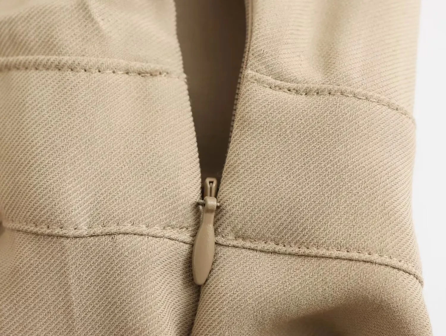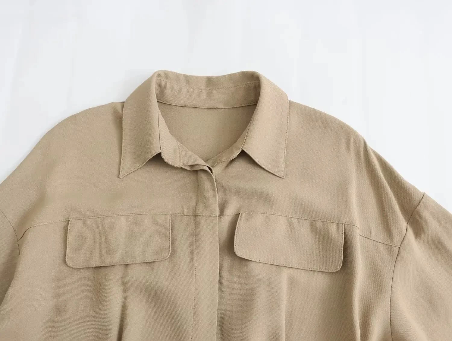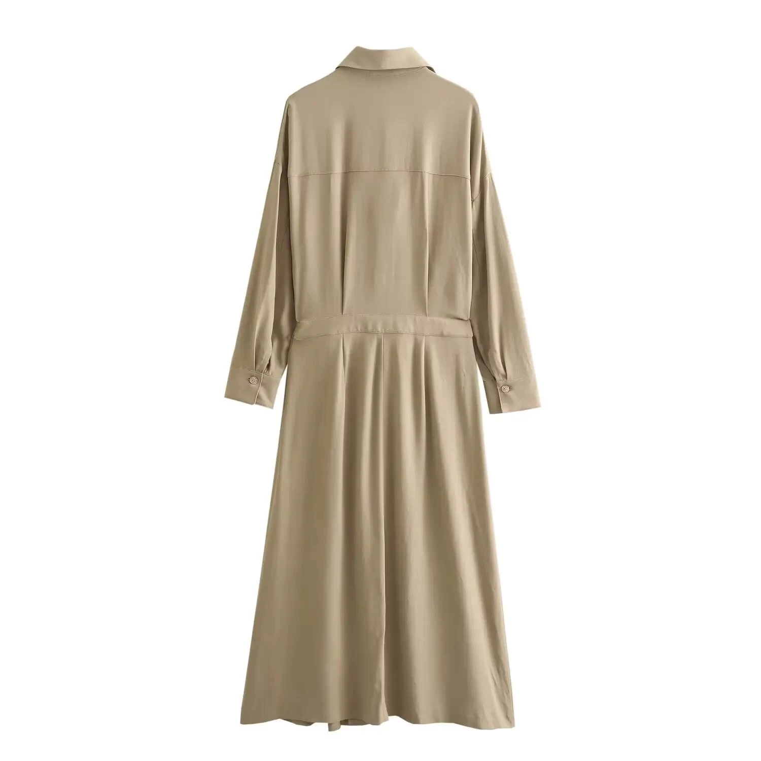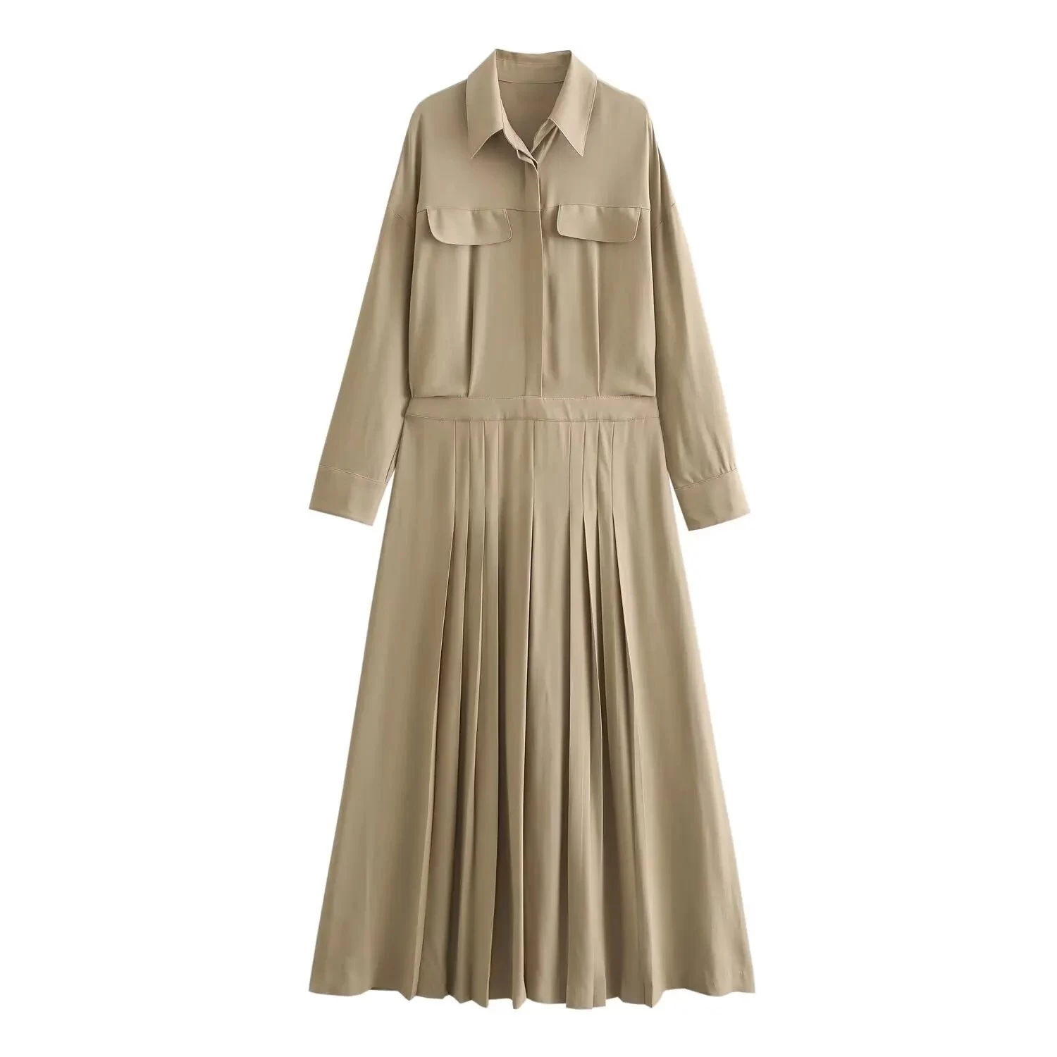 Command attention with our Womenâs Khaki Military Pleated Shirt Midi Dress, blending vintage charm with military-inspired sophistication. This dress boasts long cuffed sleeves and vintage-style shirt pockets, adding functionality and a touch of timeless elegance to the ensemble. The pleated detailing enhances the classic shirt design, while the midi length exudes refinement and versatility. Crafted from high-quality khaki fabric, this dress flatters the figure and ensures all-day comfort. Whether for a day at the office or an evening out, embrace confident style with this chic and versatile midi dress.