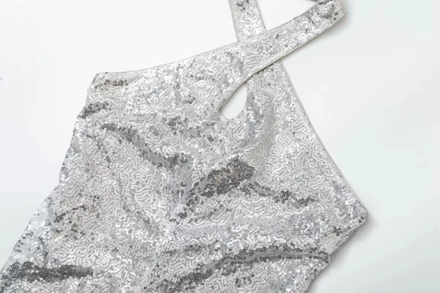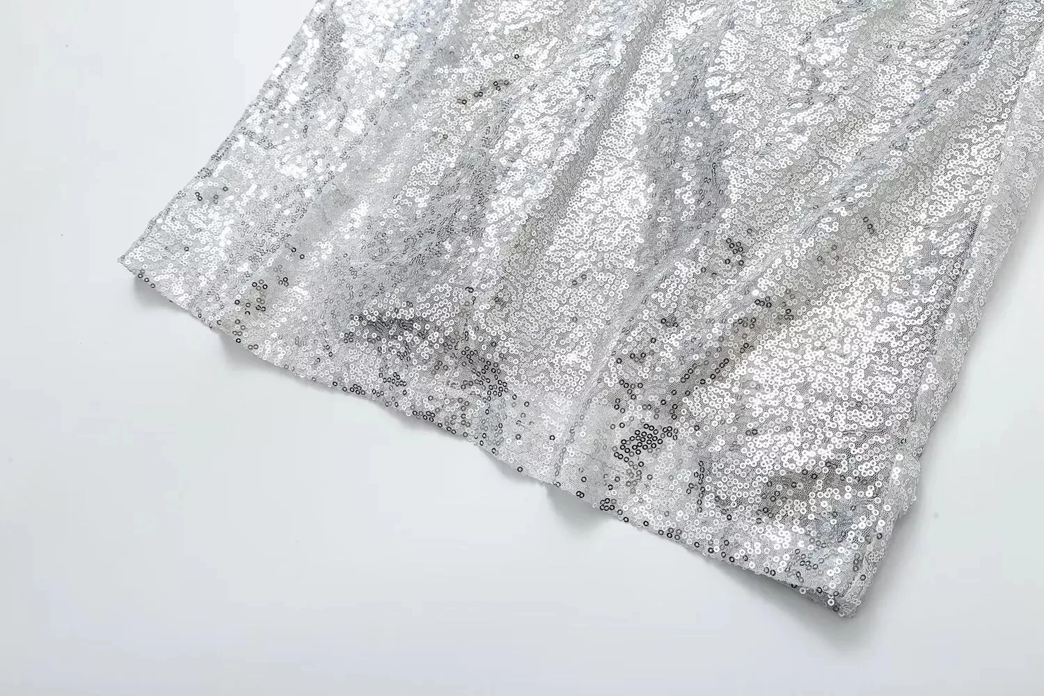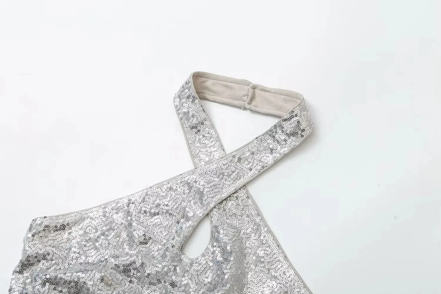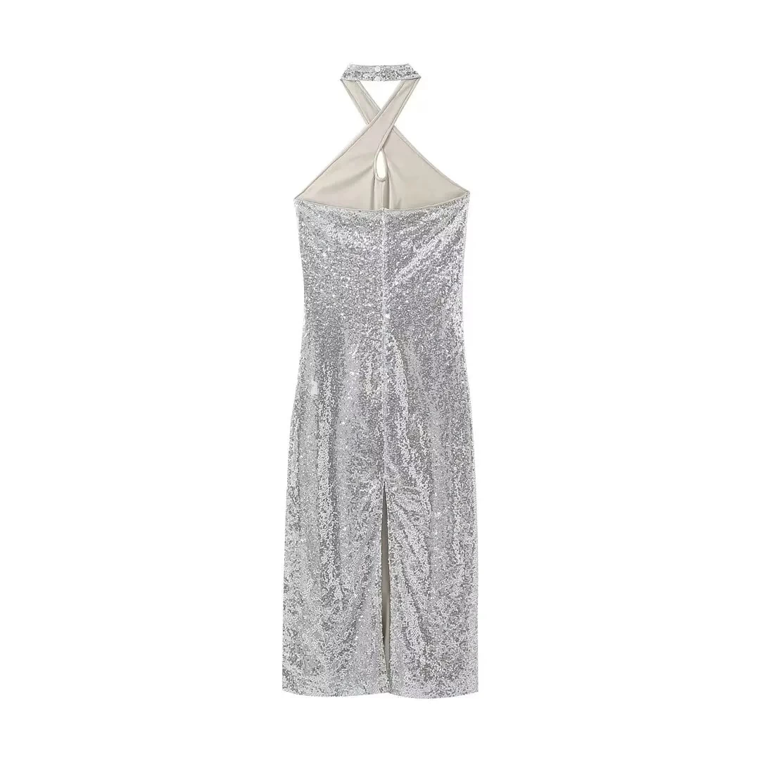 Shine bright in our Womenâs Silver Sequined Sparkle Halter Slim Fit Backless Midi Dress. This stunning dress is designed to make you stand out, featuring sparkling silver sequins that catch the light with every movement. The halter neckline and slim fit silhouette accentuate your figure, while the backless design adds a touch of allure. Perfect for special occasions or a night out on the town, this midi dress is sure to turn heads and make you feel like the star of the show.