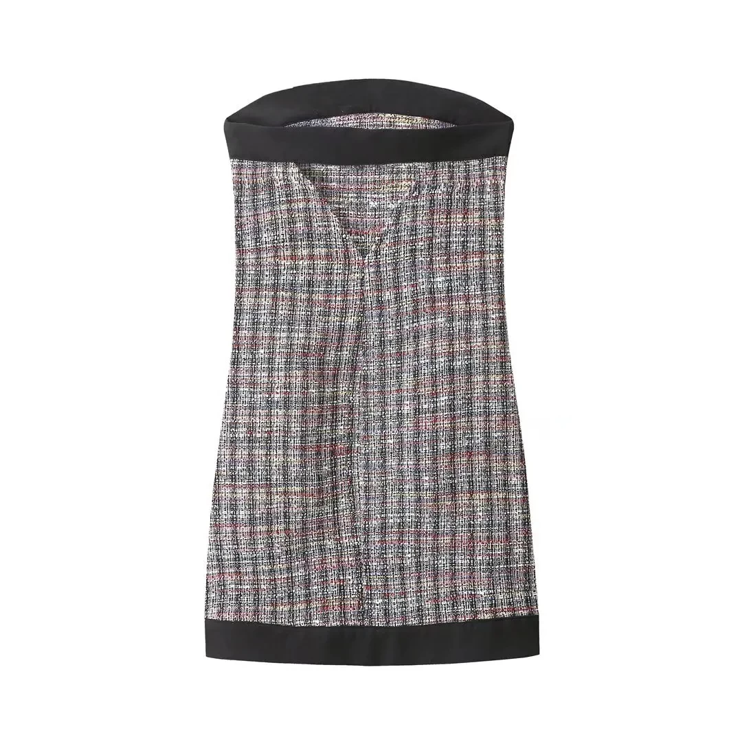 Elevate your style with our Womenâs Strapless Tube Slim Fit Tweed & Black Mini Dress. This chic dress combines classic elegance with modern flair, featuring a strapless tube design and a slim fit silhouette. The tweed fabric adds sophistication and texture, while the black detailing provides a sleek contrast. Perfect for both formal events and nights out on the town, this mini dress is versatile and stylish. Whether youâre attending a cocktail party or hitting the dance floor, this dress is sure to make you feel confident and glamorous.